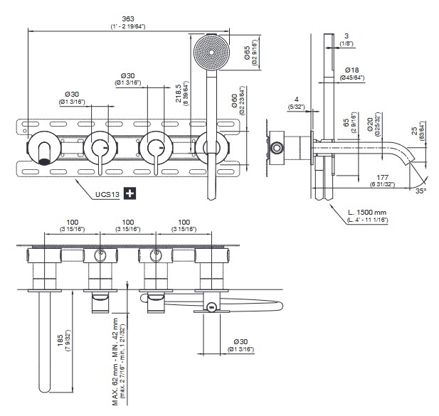 CEA Innovo Bateria wannowa ścienna z wylewką, słuchawką i wężem element zewnętrzny Satin Stainless Steel INV58YWS
