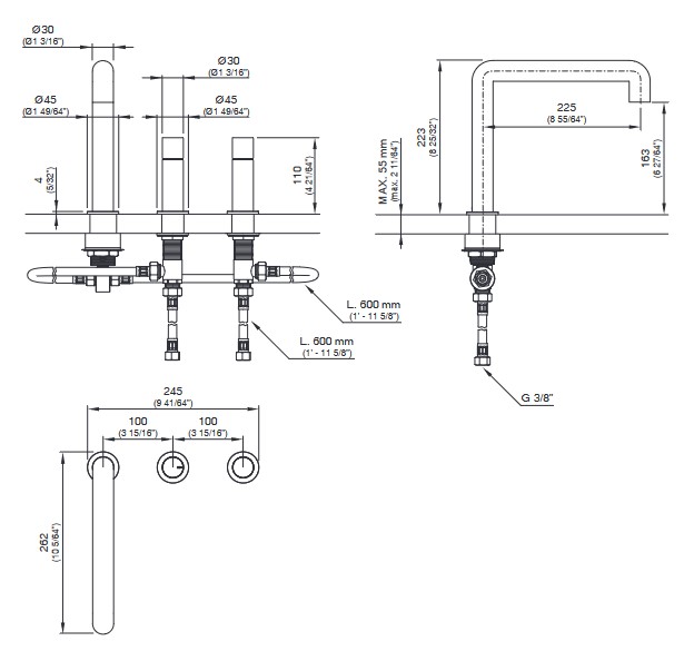 CEA Cartesio Bateria umywalkowa 3-otworowa z obrotową wylewką H22 cm Satin Stainless Steel CAR92S