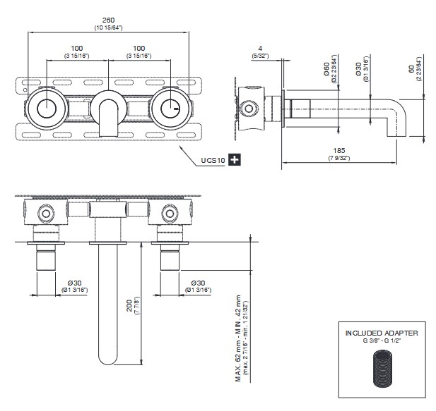CEA Cartesio Bateria umywalkowa ścienna z wylewką 20 cm element zewnętrzny Satin Stainless Steel CAR28S