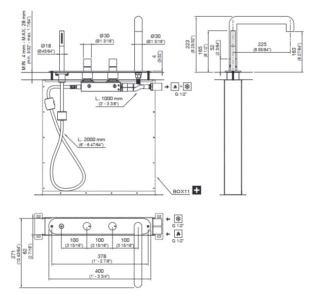 CEA Cartesio Bateria wannowa 4-otworowa na brzeg wanny z wylewką i słuchawką prysznicową element zewnętrzny Satin Stainless Steel CAR59S