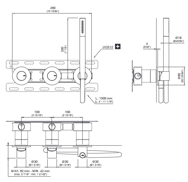 CEA Cartesio Bateria wannowa/prysznicowa ścienna z słuchawką i wężem element zewnętrzny Satin Stainless Steel CAR54WS