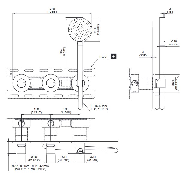 CEA Cartesio Bateria wannowa/prysznicowa ścienna z słuchawką i wężem element zewnętrzny Satin Stainless Steel CAR54HWS