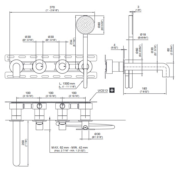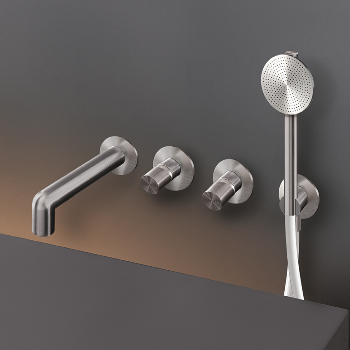CEA Cartesio Bateria wannowa ścienna z wylewką, słuchawką i wężem element zewnętrzny Satin Stainless Steel CAR55HWS
