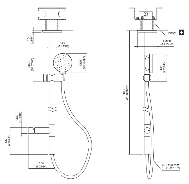 CEA Cartesio Bateria wannowa/prysznicowa sufitowa H161,5 cm z przyłączem wody, drążkiem i główką prysznicową element zewnętrzny Satin Stainless Steel CAR58WS