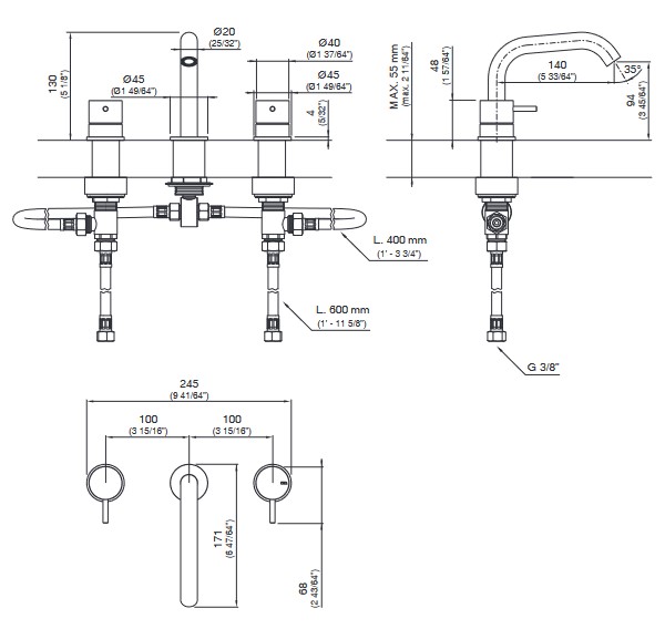 CEA Milo360 Bateria umywalkowa 3-otworowa z obrotową wylewką H13 cm Satin Stainless Steel MIL77S