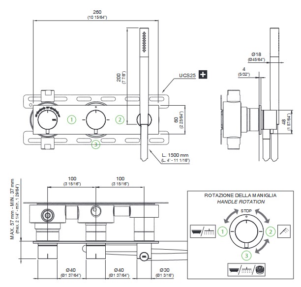 CEA Milo360 Bateria wannowa/prysznicowa ścienna termostatyczna z przełącznikiem 2/3-drożnym, słuchawką i wężem element zewnętrzny Satin Stainless Steel MIL143WS