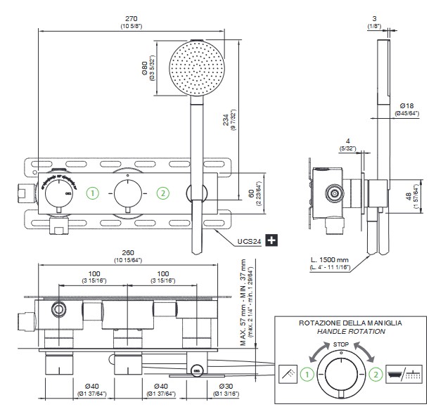 CEA Milo360 Bateria wannowa/prysznicowa ścienna termostatyczna z przełącznikiem 2-drożnym, słuchawką i wężem element zewnętrzny Satin Stainless Steel MIL25HWS