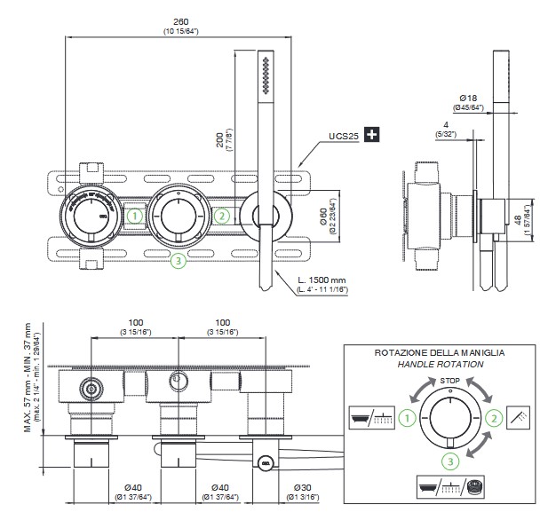 CEA Milo360 Bateria wannowa/prysznicowa ścienna termostatyczna z przełącznikiem 2/3-drożnym, słuchawką i wężem element zewnętrzny Satin Stainless Steel MIL116WS