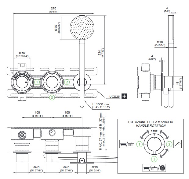 CEA Milo360 Bateria wannowa/prysznicowa ścienna termostatyczna z przełącznikiem 2/3-drożnym, słuchawką i wężem element zewnętrzny Satin Stainless Steel MIL116HWS