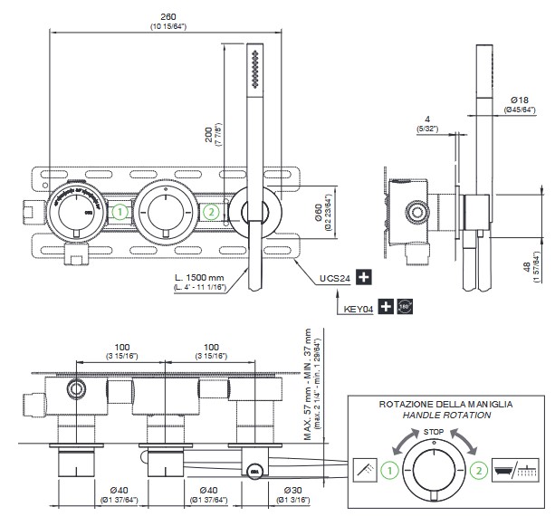 CEA Milo360 Bateria wannowa/prysznicowa ścienna termostatyczna z przełącznikiem 2-drożnym, słuchawką i wężem element zewnętrzny Satin Stainless Steel MIL115WS