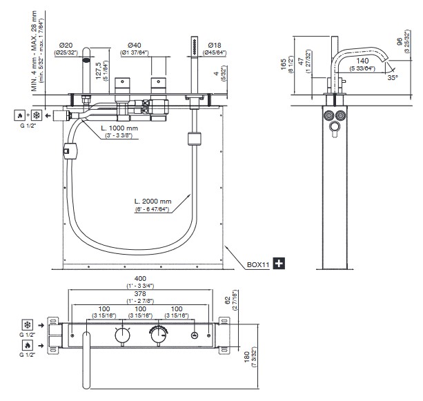 CEA Milo360 Bateria wannowa termostatyczna 4-otworowa na brzeg wanny z wylewką i słuchawką prysznicową element zewnętrzny Satin Stainless Steel MIL28S