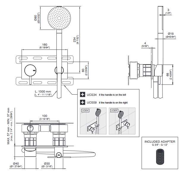 CEA Milo360 Bateria wannowa/prysznicowa ścienna z słuchawką i wężem element zewnętrzny Satin Stainless Steel MIL84HWS