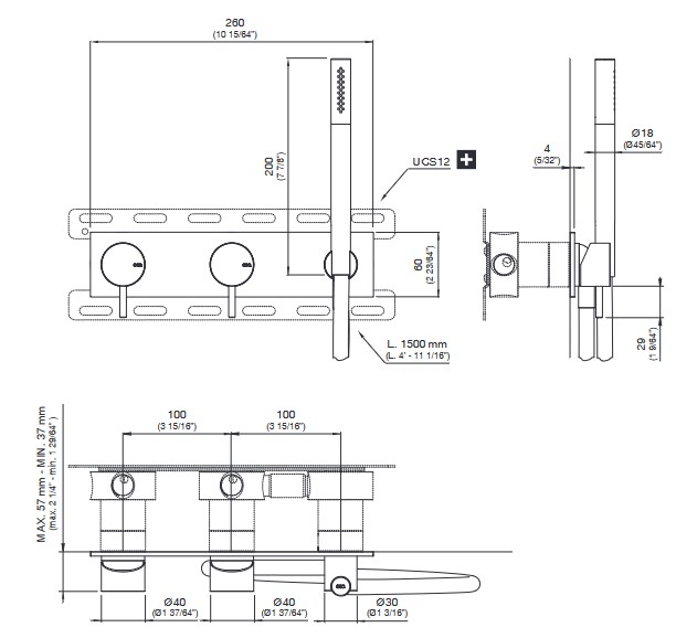 CEA Milo360 Bateria wannowa/prysznicowa ścienna z słuchawką i wężem element zewnętrzny Satin Stainless Steel MIL85WS