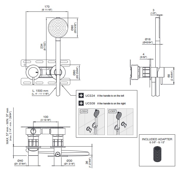 CEA Milo360 Bateria wannowa/prysznicowa ścienna z słuchawką i wężem element zewnętrzny Satin Stainless Steel MIL144HWS