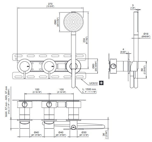 CEA Milo360 Bateria wannowa/prysznicowa ścienna z słuchawką i wężem element zewnętrzny Satin Stainless Steel MIL43HWS