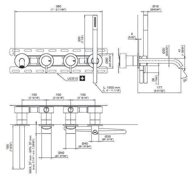 CEA Milo360 Bateria wannowa ścienna z wylewką, słuchawką i wężem element zewnętrzny Satin Stainless Steel MIL44WS