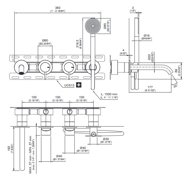 CEA Milo360 Bateria wannowa ścienna z wylewką, słuchawką i wężem element zewnętrzny Satin Stainless Steel MIL44YWS