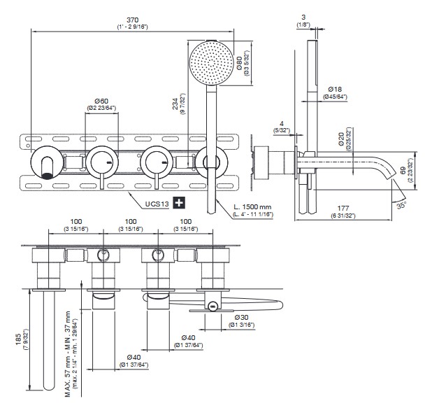 CEA Milo360 Bateria wannowa ścienna z wylewką, słuchawką i wężem element zewnętrzny Satin Stainless Steel MIL44HWS