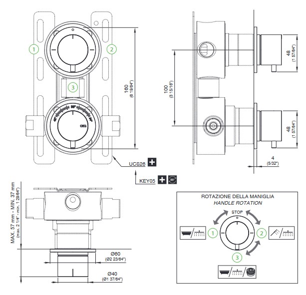 CEA Milo360 Bateria prysznicowa ścienna termostatyczna z przełącznikiem 2/3-drożnym element zewnętrzny Satin Stainless Steel MIL66S