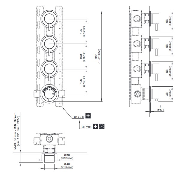 CEA Milo360 Bateria prysznicowa ścienna termostatyczna z 3 zaworami odcinającymi element zewnętrzny Satin Stainless Steel MIL123S