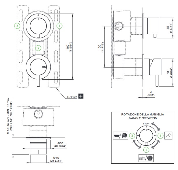 CEA Milo360 Bateria prysznicowa ścienna z przełącznikiem 2/3-drożnym element zewnętrzny Satin Stainless Steel MIL64S