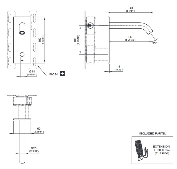 CEA Milo360 Bateria umywalkowa ścienna z czujnikiem ruchu i wylewką 15,5 cm element zewnętrzny Satin Stainless Steel MIL140RS