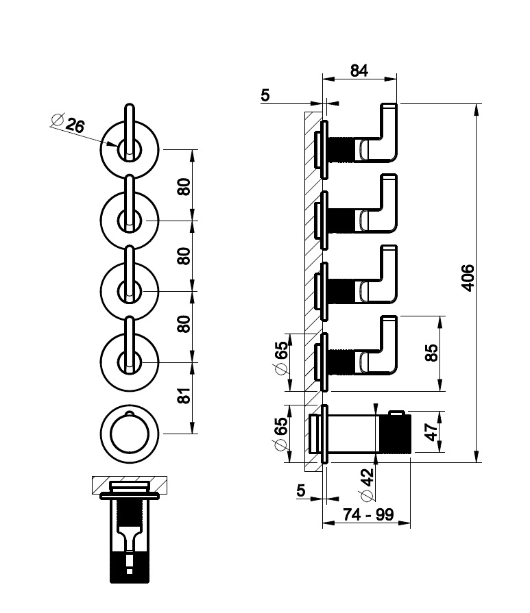 Gessi Inciso Shower Bateria natryskowa termostatyczna 5-uchwytowa podtynkowa 4-drożna - element zewnętrzny Black Metal Brushed PVD 58338.707