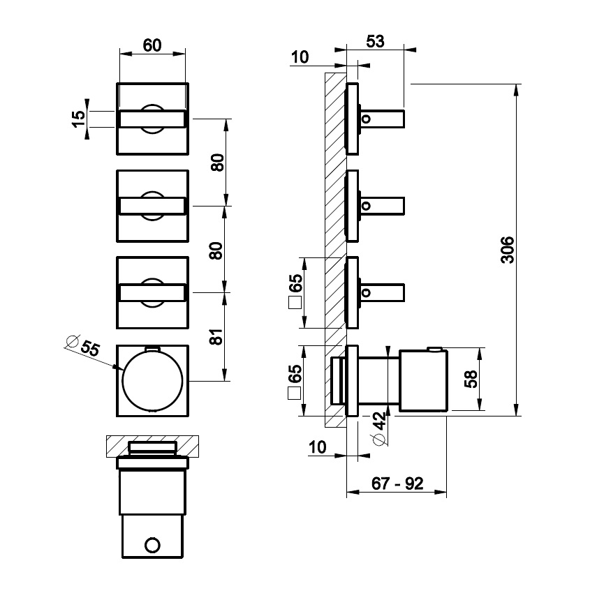 Gessi Rettangolo Bateria natryskowa termostatyczna 4-uchwytowa podtynkowa 3-drożna - element zewnętrzny Chrom 44336.031