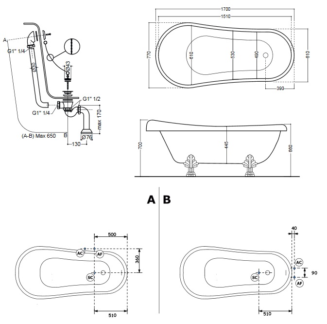 Wanna w zestawie z nóżkami, odpływem i syfonem.