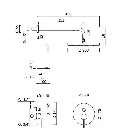 Simas Tokyo Zestaw prysznicowy podtynkowy z przełącznikiem, ramieniem, deszczownicą i słuchawką z uchwytem chrom TOSDID.CCKolor: Chrom
