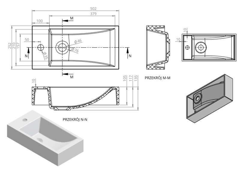 Vayer Apus Umywalka wpuszczana w blat z otworem na baterię 50,2x25,2 cm biała 050.025.011.3-1.0.1.X.0