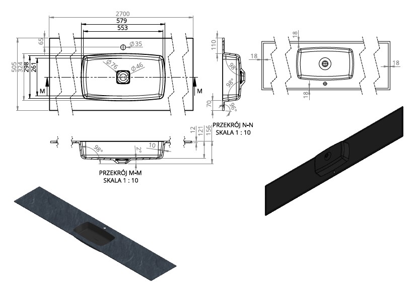 Vayer Leo-K Umywalka wpuszczana w blat z otworem na baterię 270x50,5 cm biały mat 270.050.012.3-1.0.1.X.0