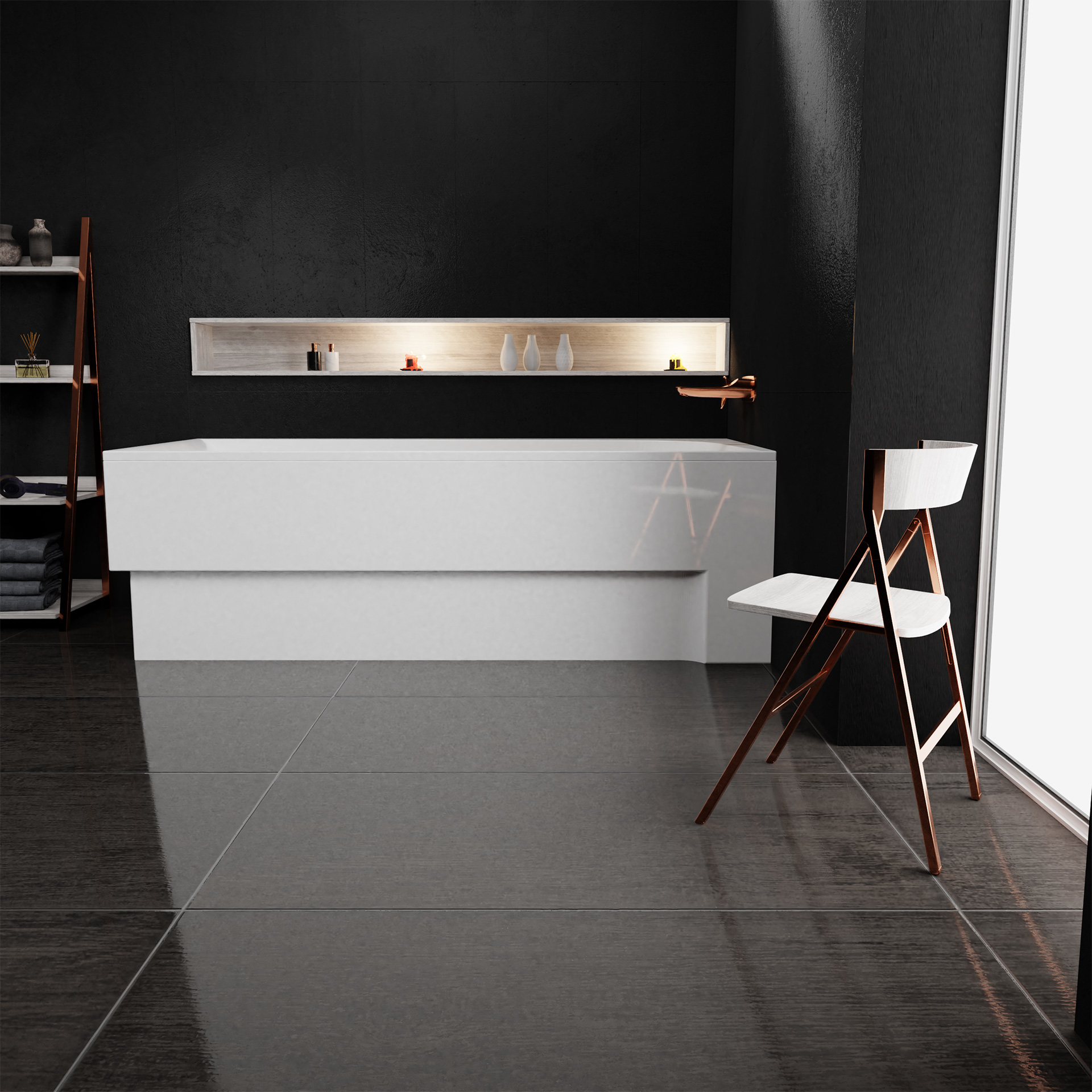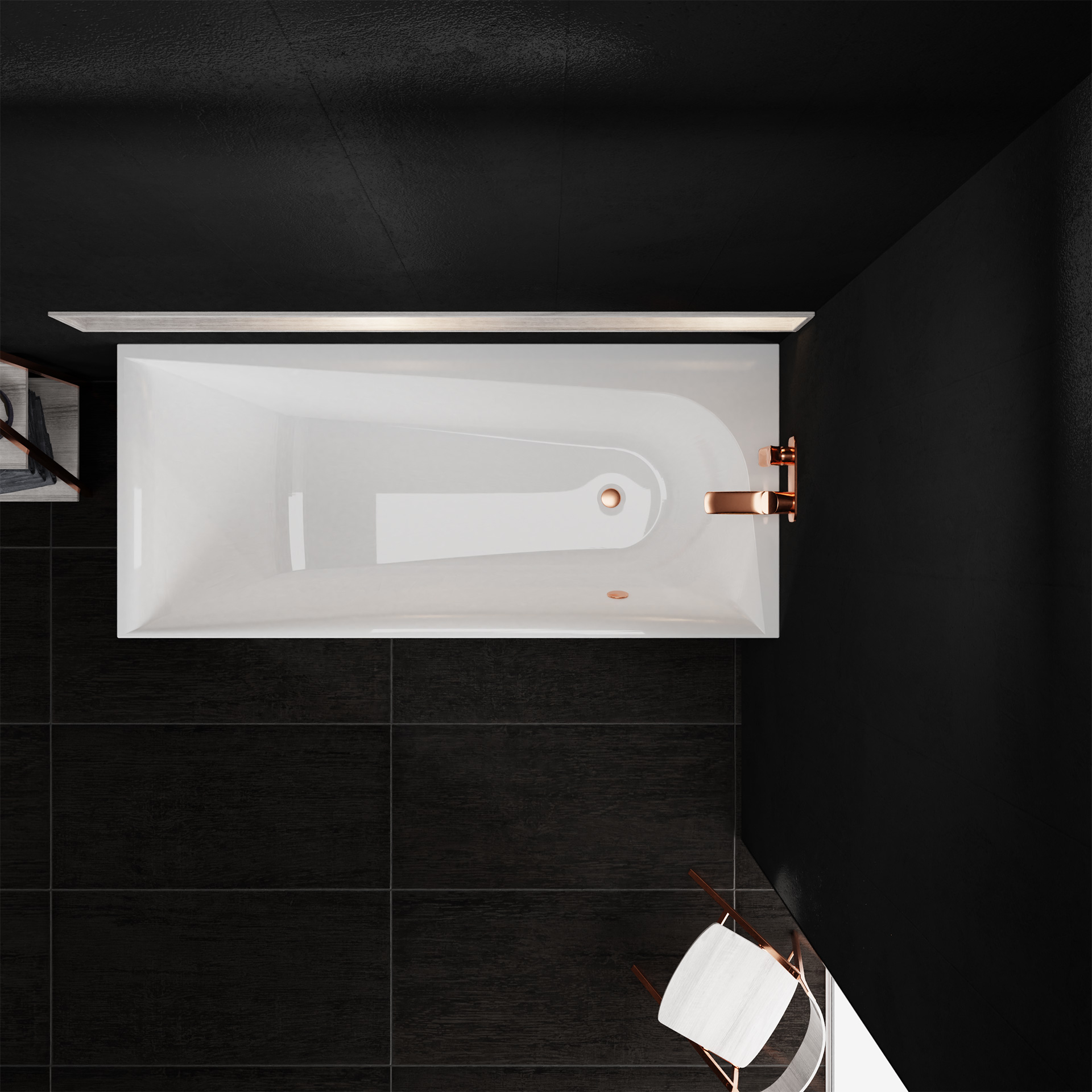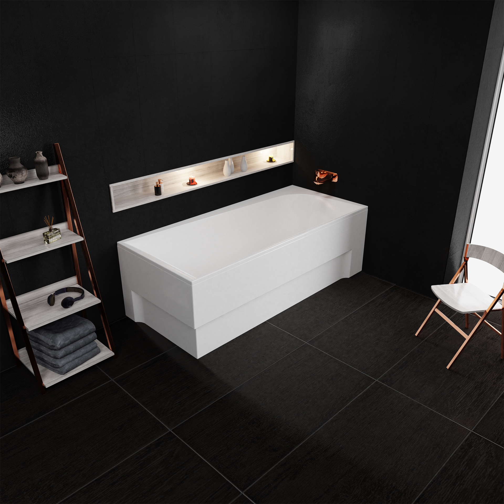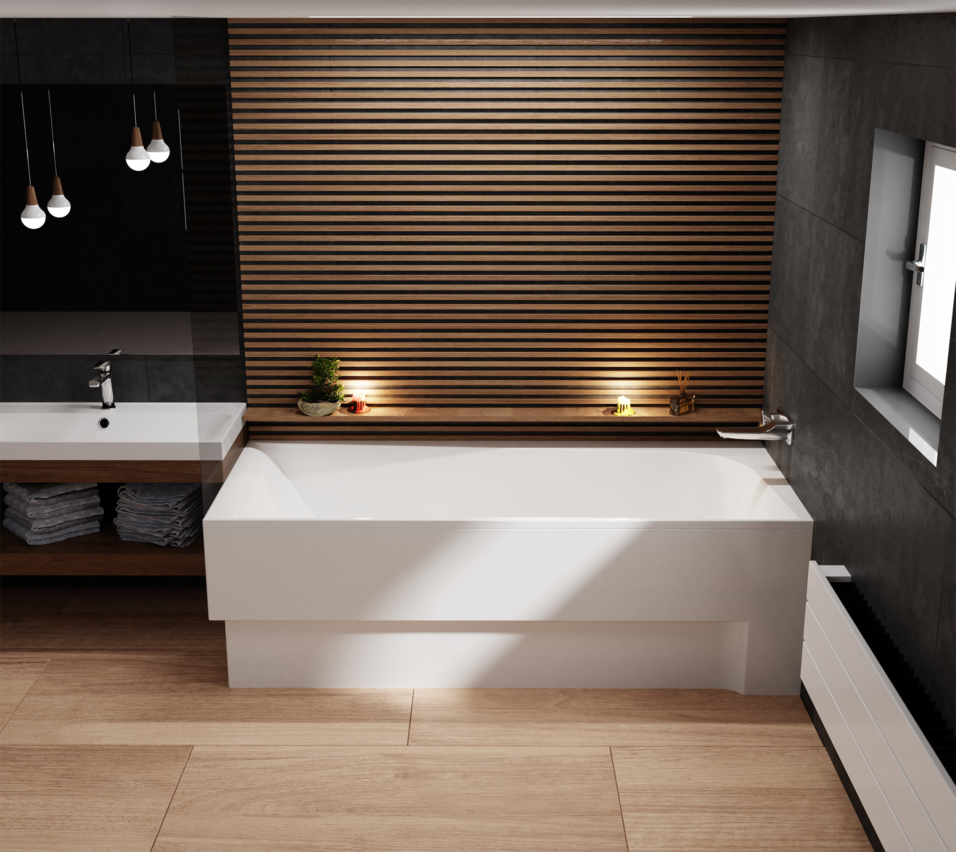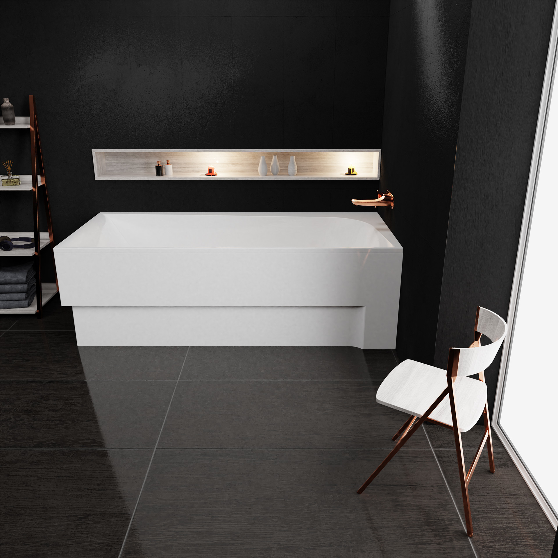 Zestaw: Wanna Boomerang prawa ze stelażem, nóżkami oraz syfonem automatycznym z przekręcanym pokrętłem do zamykania odpływu wody