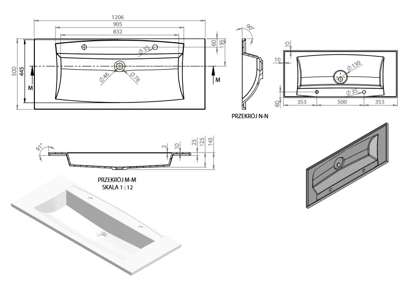 Vayer Pavo Umywalka wpuszczana w blat z dwoma otworami na baterię 120,6x50 cm biała 120.050.012.3-1.0.1.X.X