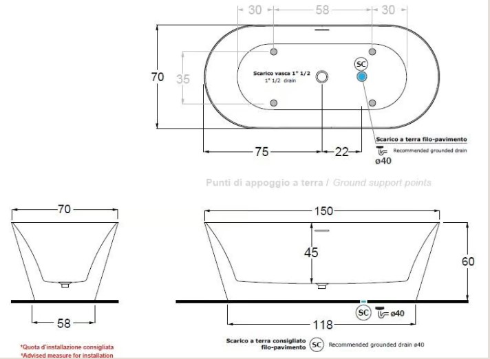 Olympia Ceramica Wanna wolnostojąca z korkiem klik klak 150x70 biały połysk VATRA15001