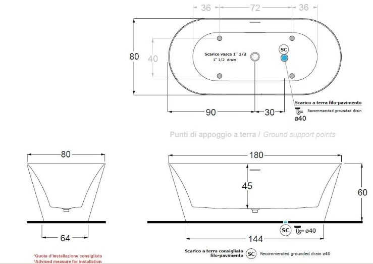Olympia Ceramica Wanna wolnostojąca z korkiem klik klak 180x80 biały połysk VATRA18001
