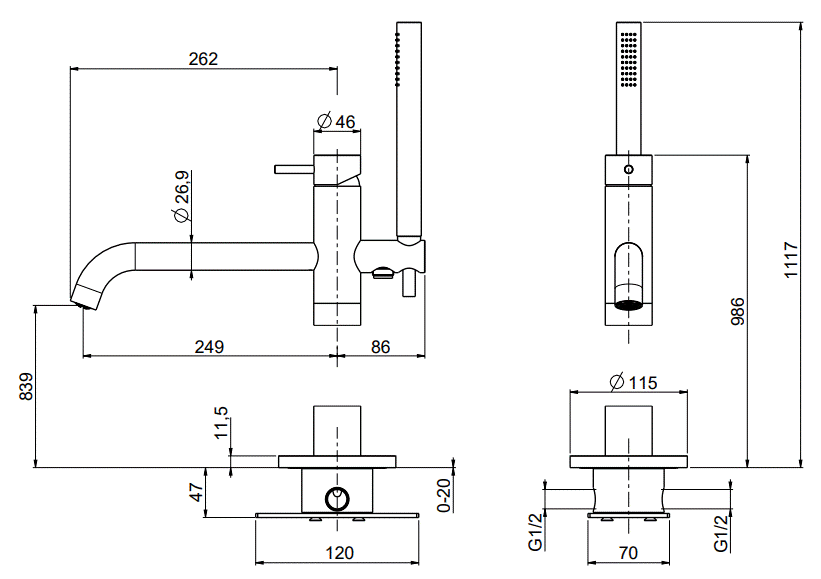 QuadroDesign Source Bateria wannowa wolnostojąca podtynkowa ze słuchawką i wężem brushed stainless steel 1262/1AS