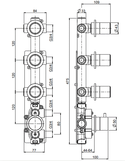 QuadroDesign Stereo Bateria prysznicowa termostatyczna podtynkowa z 3 zaworami odcinającymi brushed stainless steel 1650AS