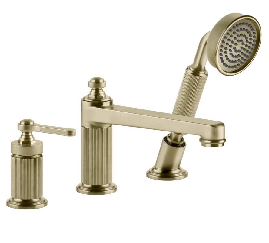 Gessi Venti20 Bateria wannowa 3-otworowa z przełącznikiem, wężem 1,5 m, słuchawką i wylewką brass brushed pvd 65037.727