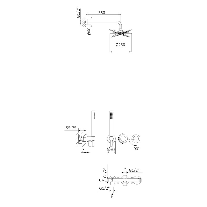 w skład zestawu wchodzi: deszczownica ścienna, bateria podtynkowa i zestaw natryskowa