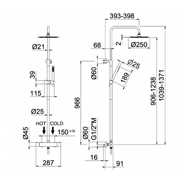 W zestawie: bateria termostatyczna, wąż 150 cm, słuchawka, deszczownica Ø25 cm