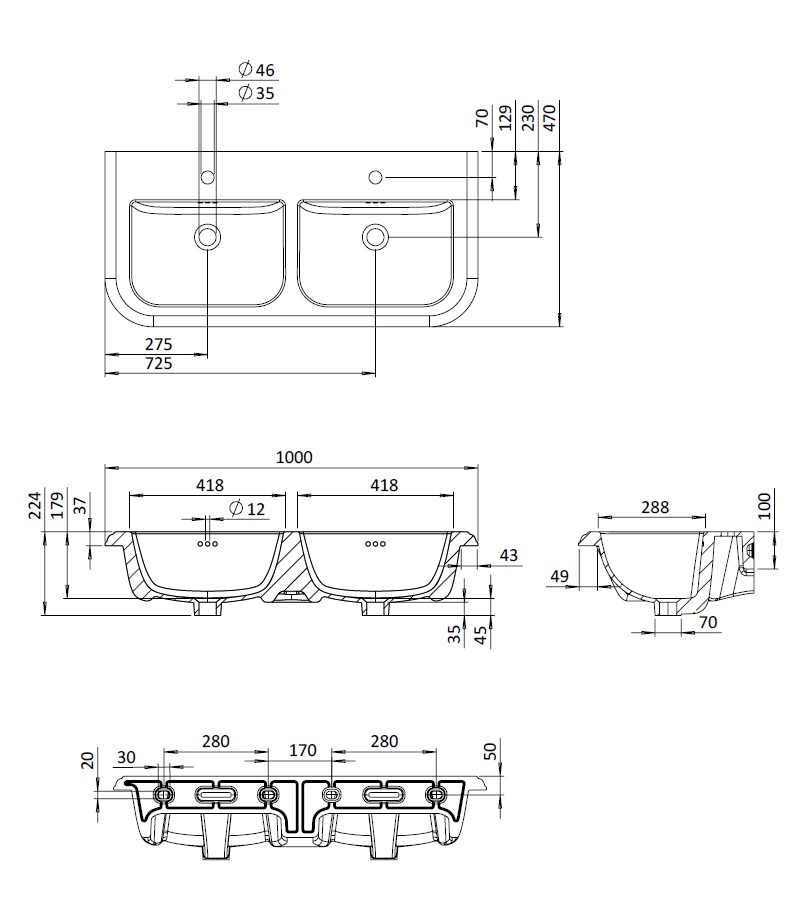 Wymiary: Długość: 47 cmSzerokość: 100 cmWysokość: 22,4 cmPasujące produkty:- Szafka CH100MB, CH100G, CH100BCena dotyczy samej umywalki