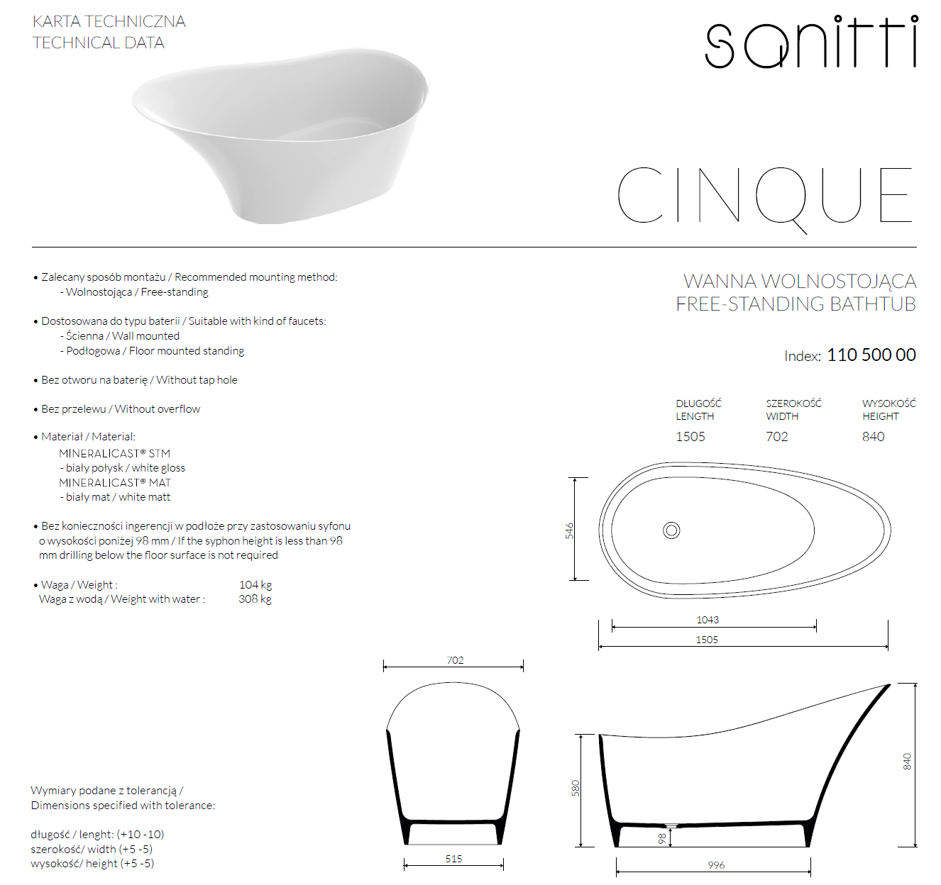 Sanitti Cinque Wanna wolnostojąca 150x70 cm Biały połysk 11050000-BP