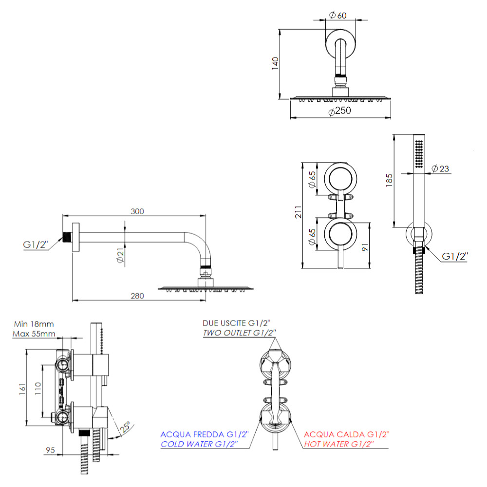 Remer X Style Inox Zestaw natryskowy termostatyczny z deszczownicą Ø 250 mm, z przyłączem i uchwytem Inox SSX92PS02UFM25