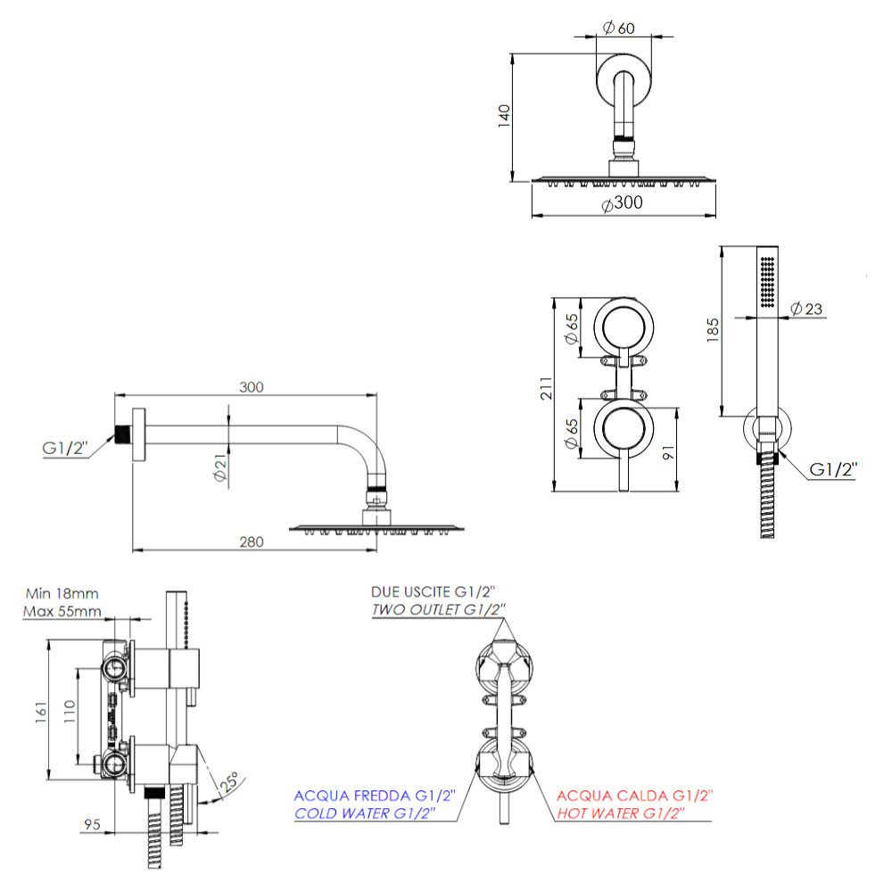 Remer X Style Inox Zestaw natryskowy termostatyczny z deszczownicą Ø 300 mm, z przyłączem i uchwytem Inox SSX92PS02UFM30