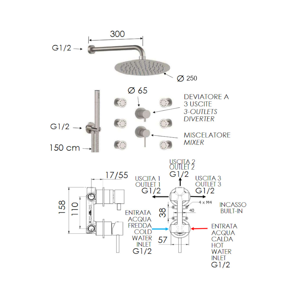 Remer X Style Inox Zestaw natryskowy termostatyczny z deszczownicą Ø 250 mm, z 6 dyszami bocznymi oraz przyłączem i uchwytem Inox SSX93PS02UFM25