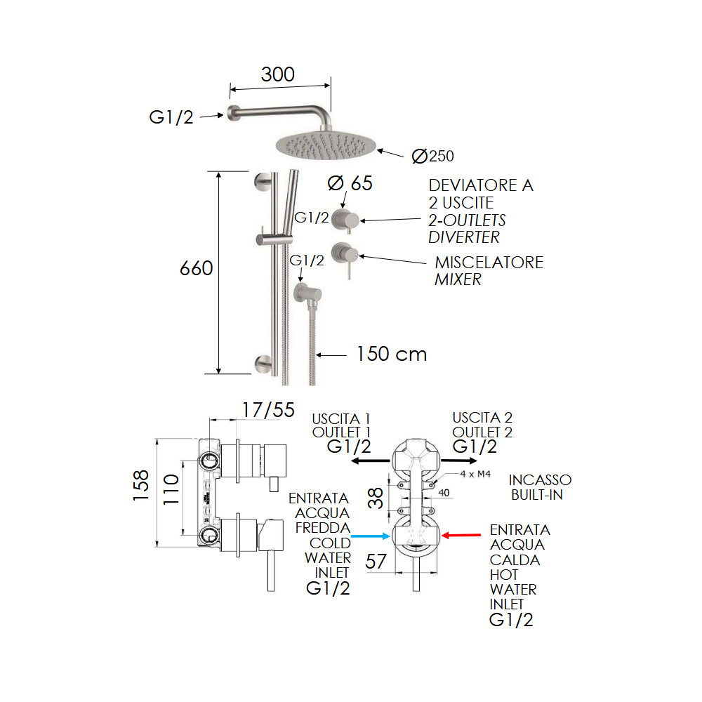 Remer X Style Inox Zestaw natryskowy termostatyczny z deszczownicą Ø 250 mm, z przyłączem oraz uchwytem na drążku Inox SSX92PS01UFM25