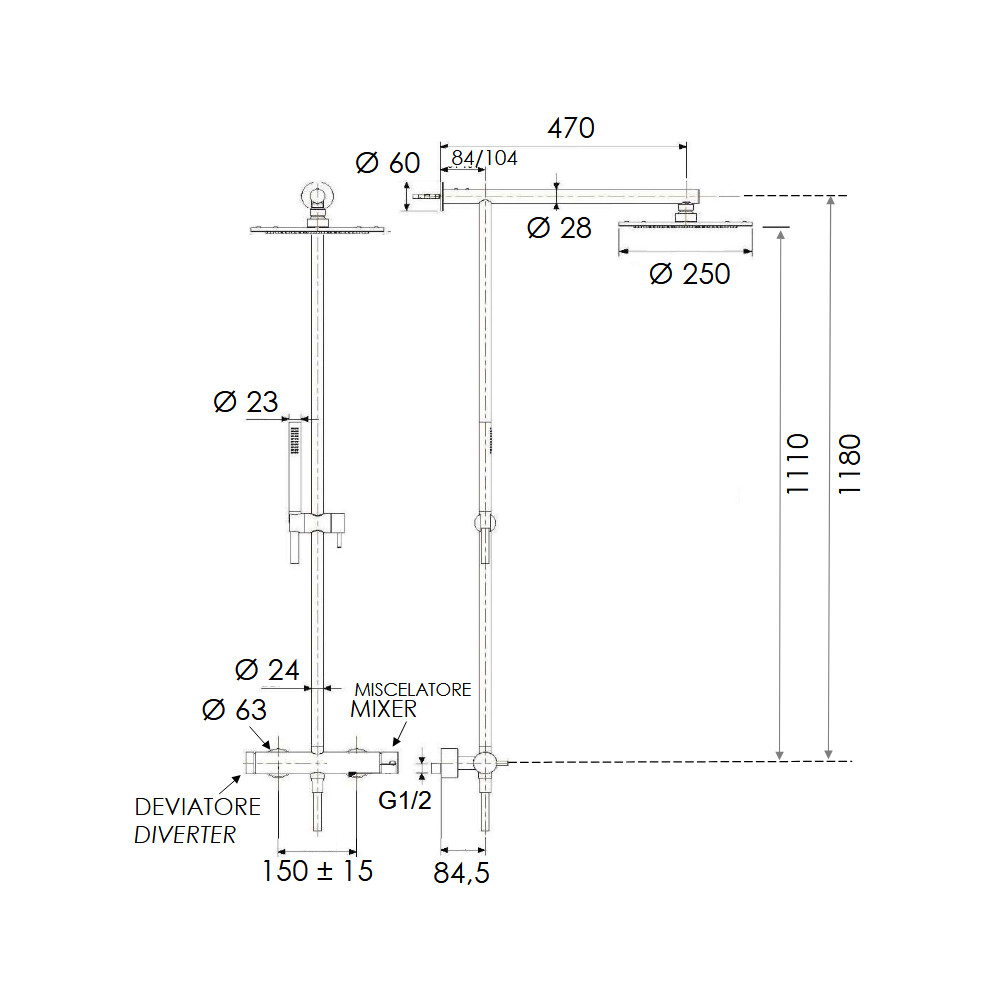 Remer X Style Inox Bateria natryskowa z kolumną i deszczownicą Ø 250 mm Inox SSX37UFM25