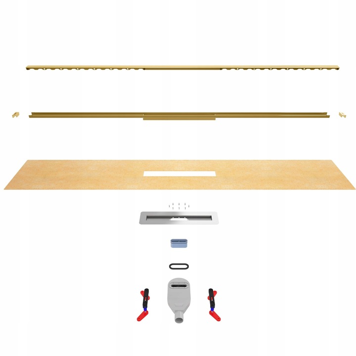 • Skład zestawu: Podstawa · Kanał odpływowy · Kratka maskująca · Mankiet uszczelniający · Syfon · Nóżki regulacyjne · Prowadnice do docinania · Brzeszczoty · Redukcja · Akcesoria