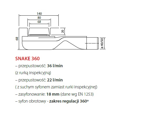 Syfon SNAKE: - przepustowość 36 l/min ( z rurką inspekcyjną ) - przepustowość 22 l/min ( z suchym syfonem zamiast rurki inspekcyjnej ) - syfon obrotowy - zakres regulacji 360° stopni - zasyfonowanie: 18 mm (dane wg EN 1253)